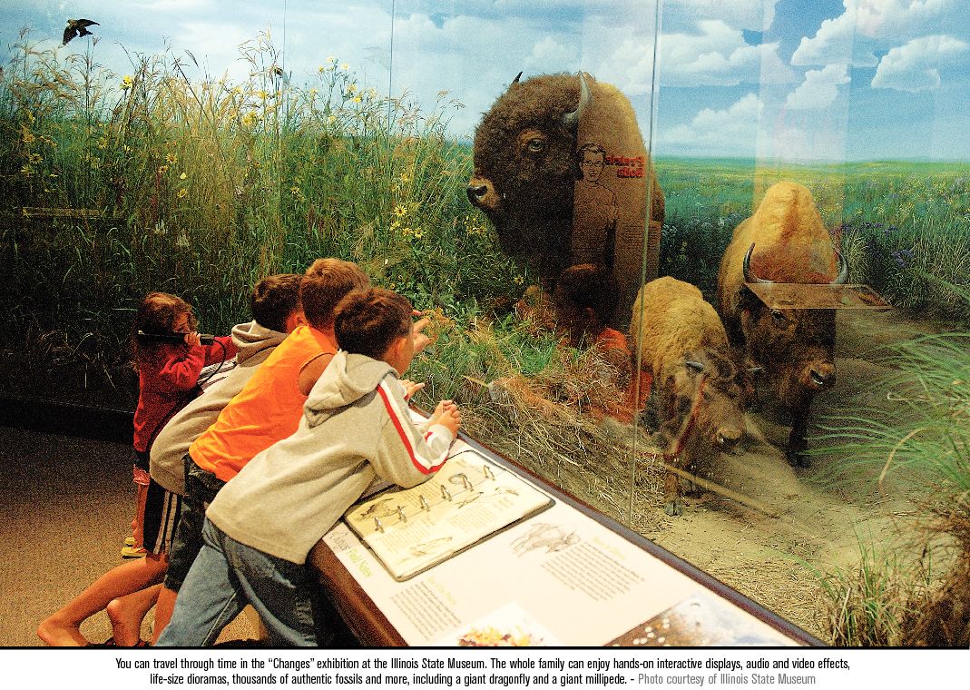 You probably didn’t know that Illinois was once located south of the equator. Or that it was once a tropical sea teeming with marine life. By traveling through time in the “Changes” exhibition, you will see what Illinois was like millions of years ago. You will glimpse an era when intriguing species once inhabited Illinois — sharks, giant dragonflies and millipedes, Jefferson’s ground sloth, the American mastodont and short-faced bears. You will learn what the land was like when the first European explorers discovered it. “Changes” is not just a learning experience. It’s an adventure through 500 million years of environmental change in Illinois.