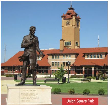 Union Square Park Union Square Park, also located across the street from the Abraham Lincoln Presidential Library and Museum, is home to two Abraham Lincoln statues, one showing him relaxing on a bench and the other struggling to keep his coat closed against the harsh wind. And it is beautifully landscaped with William Baffin Climbing Roses, Mary Todd Daylilies, Black-eyed Susan, Wintergreen Littleleaf Boxwoods, Autumn Blaze Maples, Ozark Spring Flowering Dogwoods and Accolade Elms, providing the perfect backdrop for relaxation. The park is the site of occasional concerts and special events hosted by the Abraham Lincoln Presidential Library and Museum. Events of 15 or more people are required to secure a park permit. To obtain a permit, email sabrina.manci@illinois.gov or call 217-558-9014. Union Station is open 9 a.m.-5 p.m. daily and the park is open from 8 a.m.-10 p.m. daily.